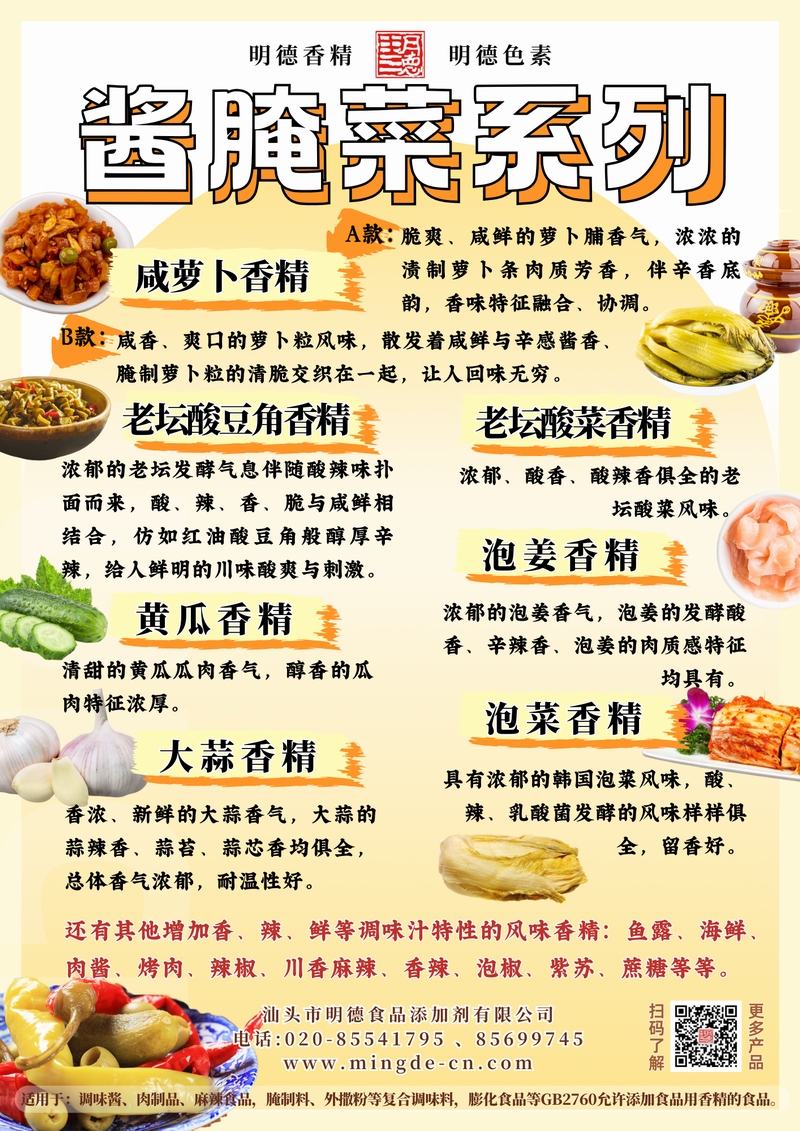 汕頭市明德食品添加劑有限公司的醬腌菜系列香精,涵蓋咸蘿卜、老壇酸豆角、老壇酸菜、黃瓜、泡姜、泡菜、大蒜等多種品類。香氣真實、留香穩(wěn)定,適用于鹵味熟食、腌制菜肴、復(fù)合調(diào)味料、調(diào)味醬、速食及方便食品等B端應(yīng)用,幫助工廠打造具有地道風味特征的產(chǎn)品。